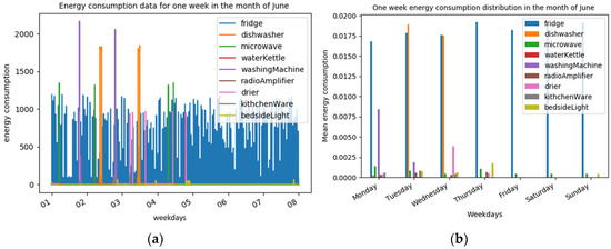 (a) Home building energy consumption data processing and analysis with respect to each appliance for the period of eight days in the month of June (b) Mean energy utilization distribution and comparison in the weekdays.