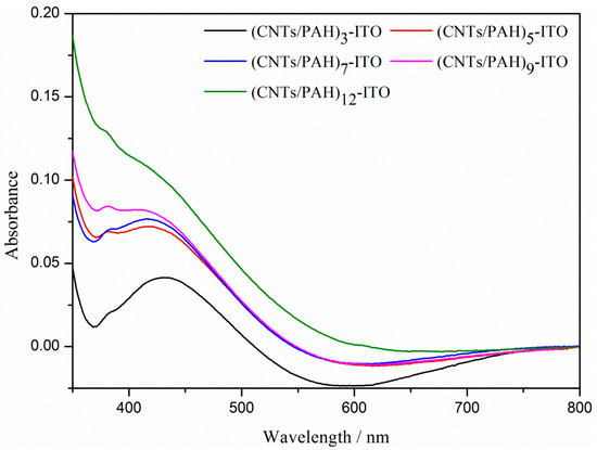Ultraviolet-visible near-infrared (UV–vis-NIR) spectroscopy of the (CNTs/PAH)n-deposited ITO electrode (n = 3, 5, 7, 9, 12).