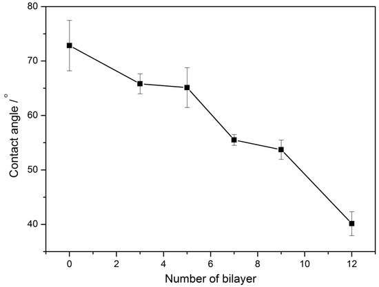The static water contact angles (θc) of the multilayer film (CNTs/PAH)n-deposited ITO electrodes were tested to evaluate their hydrophilicity. As shown in Figure 2, the θc of the bare ITO electrode was 72.84 ± 4.64°and with the increase of bilayer number from 3 to 12, the θc of the multilayer film (CNTs/PAH)n-deposited ITO electrode gradually decreased from 65.82 ± 1.83° to 40.14 ± 2.20°. This indicated the hydrophilicity improvement of the anode surfaces.