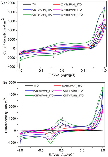 Cyclic voltammetry (CV) of the (CNTs/PAH)n-deposited ITO electrode (n = 0, 3, 5, 7, 9, 12) before (a) and after (b) 25 h of chronoamperometry at a scan rate of 100 mV/s.
