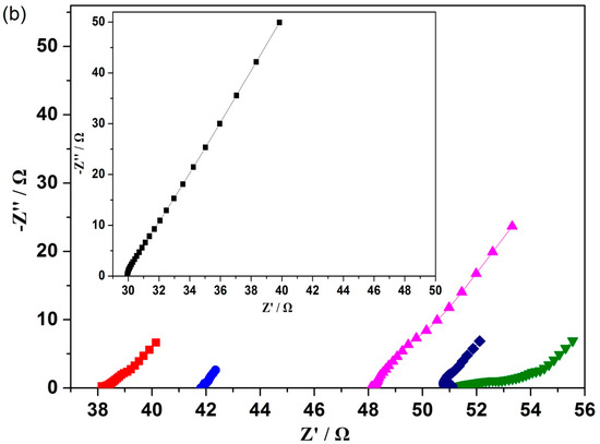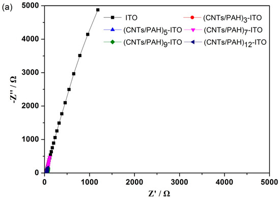 The electrode interfacial resistance of bare and multilayered film-deposited ITO electrodes was measured by electrochemical impedance spectroscopy (EIS). As shown in Figure 5, the ITO electrode had no defined semicircle. The impedance plots of 3, 5, 7 and 12 bilayer modified ITO electrodes were dominated by a capacitive-like line and the deviation of phase angle from -90 degrees at low frequencies, which indicated porous conducting films [42]. Furthermore, the short straight line at low frequencies of the impedance plots of 3, 5, 7 and 12 bilayer modified ITO electrodes suggested the diffusion control in the doping/de-doping process [23]. These narrow regions of the diffusion control process indicated fast reactant diffusion without limitation over a wide frequency range, due to the well-formed nanostructure porous film on the surface of electrode [43]. However, the Nyquist plots of the (CNTs/PAH)9-deposited electrode displayed a semicircle in a high frequency range and a straight line in a low-frequency range, which indicated the combination of charge transfer and mass transfer processes on the electrode [44]. This unique property could ascribe to the well-formed nanostructure and accumulation of highly conductive CNTs on 9 layers of the CNTs/PAH modified electrode. In addition, the intercept of the real part (Z′) representing the ohmic resistance (Rs) increased with the layer number. The Rs of the bare ITO electrode and 3, 5, 7, 9 bilayer modified ITO electrodes were 29.93, 38.15, 41.81, 48.1 and 51.41 Ω respectively. The Rs of the (CNTs/PAH)12-deposited electrode (51.03 Ω) was nearly the same as that of the (CNTs/PAH)9-deposited electrode. This suggested that the modification of layers increased the connection resistance between the ITO substrate and the deposited multilayer [43,44].