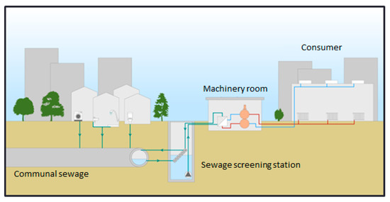 The general scheme of a district heating and cooling system using sewage heat recovery is displayed in Figure 1. Communal sewage is accessible at relatively close distance from the thermal energy consumer. After screening, sewage exchanges heat with a vapor compression heat pump, located in the machinery room, that supplies thermal energy to the consumer through a heating and cooling network.