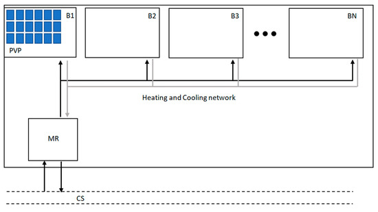 DHC system layout: communal sewage (CS), machinery room (MR), photovoltaic plant (PVP), buildings (B1, B2, B3, …, BN).