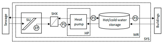 Hydraulic scheme and system boundaries: screening unit (SU), elevation pump (EP), sewage heat exchanger (SHX), auxiliary pumps (P1, P2), network pump (P3), heat pump boundary (HP), machinery room (MR) and overall system boundary (SYS).