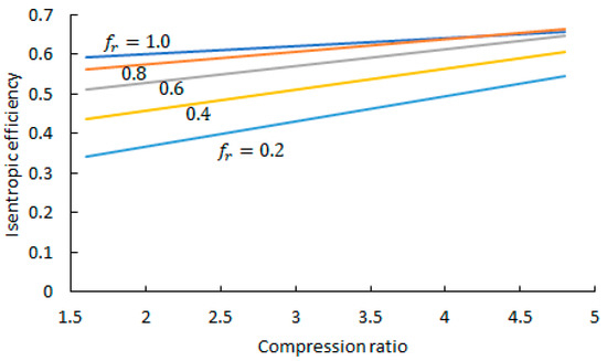 The heat pump model predicts condenser heat duty (), evaporator heat duty () and compressor power input () at different values of chilled water inlet temperature (), chilled water mass flow rate (), hot water intel temperature (), hot water mass flow rate () and compressor frequency () by means of thermodynamic modelling. The reference unit is a screw chiller of 788 kW heating capacity using R134a as refrigerant [15]. Based on the refrigerant property [16], the cycle state points are determined by imposing constant temperature differences for the following temperature pairs: refrigerant condensation and hot water outlet (0 K), hot water inlet and refrigerant at condenser outlet (1 K), chilled water outlet and refrigerant evaporation (1 K), chilled water inlet and superheated vapor at evaporator outlet (1 K). Isentropic efficiency as function of compression ratio () and frequency ratio () is used for calibrating the model output with the performance data derived from the manufacturer’s datasheet. The resulting functional dependency is shown in Figure 4.