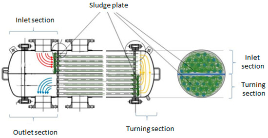 One of the main issues with the SHX is sludge accumulation at the inlet sections of the tube banks, which progressively decreases flow passage area (), sewage mass flow rate (), and ultimately heat transfer rate. Cleaning is thus necessary to periodically restore the nominal performance. To calculate the influence of performance degradation, a model for the prediction of sewage flow rate is developed starting from the balance equation for the mass of sludge: