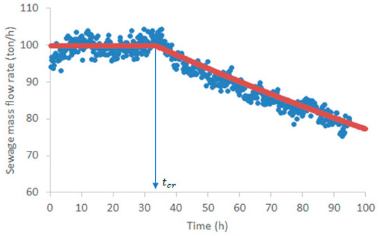 where is a constant, is the pressure drop across inlet and outlet sections, and is the flow passage area which is equal to after cleaning. The reduction of is not directly proportional to sludge accumulation because initially sludge is likely to accumulate in stagnation zones which do not contribute to flow passage area. For the derivation of an approximated empirical law, a critical sewage mass (), after which becomes proportional to through a constant proportionality factor (), is assumed: