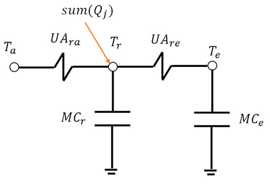 The two-node capacitive building model is shown in Figure 7, whose states are room air temperature () and inner building envelope temperature () and refers to the ambient temperature. Such a model is selected because as compared to more sophisticated models, it requires a minimum set of input data that can be easily tuned based on floor area, indoor volume, building envelope insulation characteristics, and target specific heating and cooling demands: