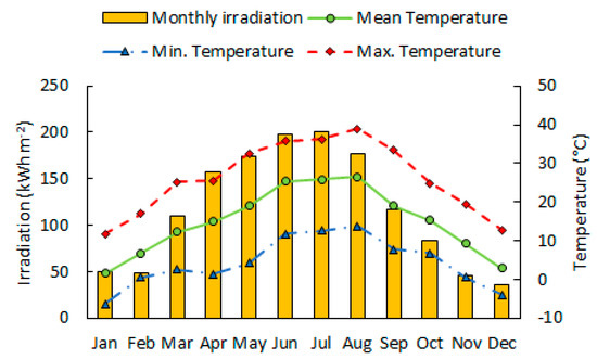Monthly solar irradiation on the horizontal plane and outdoor temperatures.