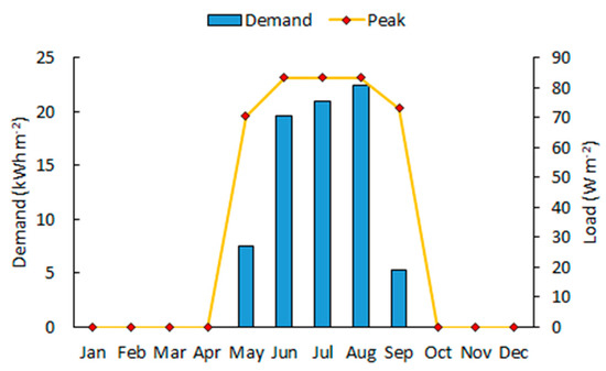 The total floor area of the commercial district is estimated at 12,000 m2. Based on the building model input figures (see Table A3), heating and cooling hourly loads are calculated. The corresponding monthly values are shown in Figure 10 and Figure 11. The specific annual heating and cooling demands are 104 kWh/m2 and 76 kWh/m2, while the respective specific peak thermal loads are 87 W/m2 and 83 W/m2. These values are in line with the typical heating and cooling demands in the commercial sector in northern Italy. The overall heating and cooling annual demands are 1251 MWh and 912 MWh, and the peak loads are respectively 1050 kWt and 1000 kWt.