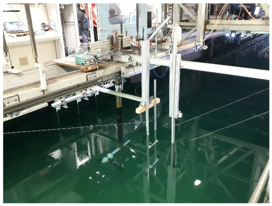 The experimental campaign encompassed testing of a small-scale horizontal-axis turbine of 0.9 m rotor diameter at the CNR-INM (formerly INSEAN) towing tank in Rome. The tank dimensions are 9 × 3.5 × 220 , resulting in a blockage ratio of 2.8%. The low blockage characteristics in the facility ensured little influence of this should be seen in any of the tests. The center of the turbine hub was installed at 1.5 below the still water surface on a steel stanchion clamped from above and positioned in the mid-section of the tank as shown in Figure 1.
