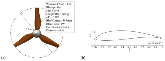 Rotor schematic for the 0.9 HATT used for the testing (a) and Wortman FX 63-137 profile used to create the turbine blade geometry (b).