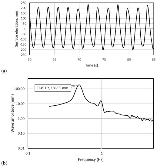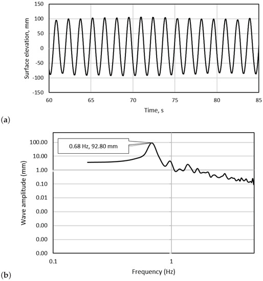 Surface elevation of one of the Regular wave-tow cases, demonstrating an average wave height of 0.19 m (a,b) the frequency spectrum of the signal.