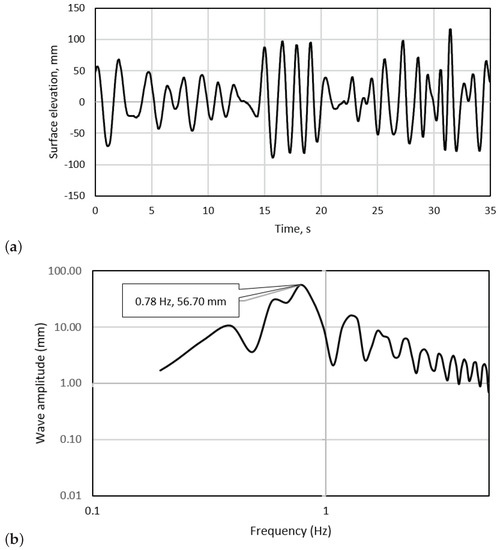 Water surface elevation time series for the irregular wave case undertaken (a,b) the frequency spectrum of the signal.