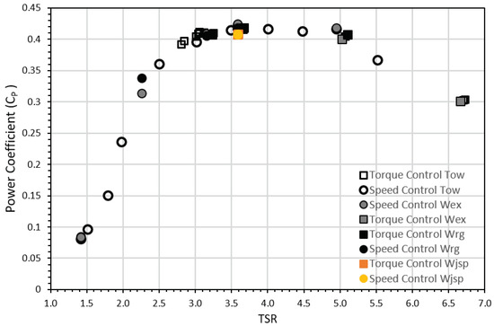 Power Coefficient ()—Tip speed ratio (TSR) curve including all the test cases for both control strategies.