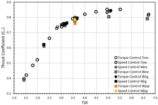 Thrust coefficient ()—Tip speed ratio (TSR) curve including all the test cases for both control strategies.