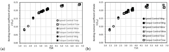 Average blade root bending moment coefficient () for blade 2 (a) and blade 3 (b) versus tip speed ratio (TSR). Please note that there is not available for the irregular wave-tow tests.