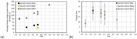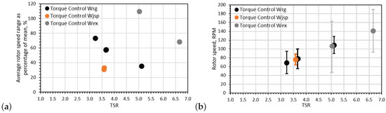 Figure 9a shows the average turbine rotational velocity fluctuation per wave period plotted against TSR for the torque control cases. The average maximum and minimum values of rotational velocity per wave period compared to the TSR are also included in Figure 9b for the same set of cases. The average maxima and minima observed are highlighted by the upper and lower error bars, respectively. The speed control cases have been omitted in Figure 9 as the oscillations in rotational velocity are inherently limited by the control strategy adopted.