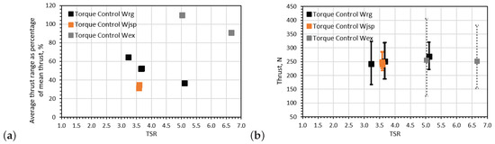 The average rotor thrust fluctuations per wave period are plotted in Figure 11 and Figure 12 for the torque and speed control cases, respectively. It is clearly visible that using the torque control mode induces higher thrust fluctuations in the three wave-tow cases. It is visible that there is an opposite trend in the fluctuations occurring in the rotor thrust when using a specific control type. When the speed control mode was used, a linear increase in the variation of the thrust loading was observed in both wave-tow tests whereas a linear decrease in thrust fluctuations is observed when the torque control mode is applied. This contradicts the information reported by [5], who employed a torque control strategy in the experimental campaign and found an increase in the fluctuating thrust coefficient with TSR. However, it is somewhat difficult to compare both results as the fluctuating thrust coefficient shown in [5] was only indicated by a standard deviation value rather than a difference in amplitude between peak values, as it is presented here. Moreover, there are other differences between studies such as waveforms, flow velocities, facility types, and rotor types which will contribute to discrepancies between studies.