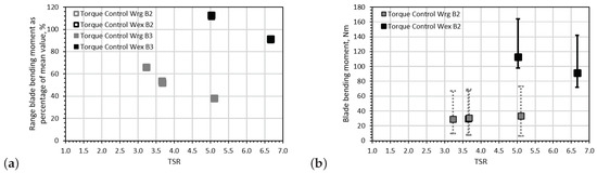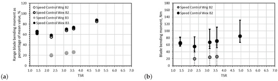 Figure 13 and Figure 14 show the average bending root moment fluctuations per wave period only for torque and speed control cases, respectively. The trend between the average values of the bending moment fluctuations of blade 2 and blade 3 is almost identical. Hence the reason of only using the values of blade 2 to show the maximum and minimum values on Figure 13b and Figure 14b. The pattern of the fluctuations when applying torque or speed control is similar to that presented in Figure 11 and Figure 12 with fluctuation size increasing with TSR in speed control mode but decreasing with TSR in torque control mode.
