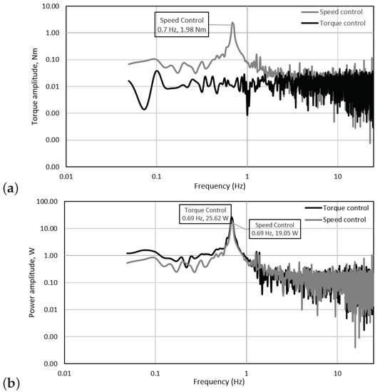 Frequency domain graphs for a regular wave-tow test at peak power condition of TSR = 3.6, i.e., 76 rpm, 15 Nm for rotor: (a) torque and (b) power.