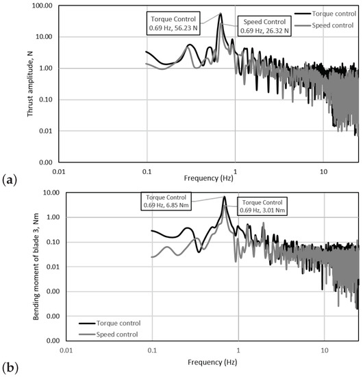 Frequency domain graphs for a regular wave-tow test at peak power condition of TSR = 3.6, i.e., 76 rpm, 15 Nm for: (a) thrust and (b) root bending moment blade 3.