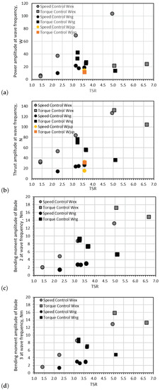 Amplitudes observed at wave frequencies of: (a) power, (b) rotor thrust, (c) root bending moment blade 2 and (d) root bending moment blade 3.