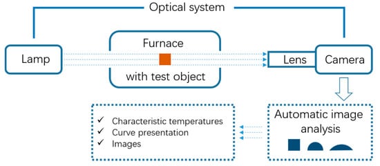 Hot-stage microscopy (HSM) has been widely used to study the sintering phenomena in biomass ash [4,11,23,24,26,29]. In this study, a side-view hot stage microscope (EM201, Hesse Instruments Company, Osterode am Harz, Germany) was used to determine the sintering phenomena during the ash melting point test, and a schematic image of it is shown in Figure 1. The HSM was equipped with an electrical furnace (Hesse HT-16, Osterode am Harz, Germany) and an image analysis system with a hot stage camera (Leitz CCD camera, Wetzlar, Germany). The HSM software calculates the projection image of the test object in three dimensions (including height, width, and area) to recognize the characteristic temperatures during the melting process.