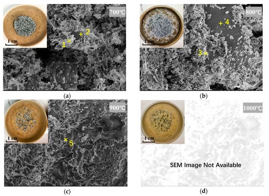 Macroscopic and microscopic images of WSGO and WSGL ashes heated at 700–1000 °C are shown in Figure 3 and Figure 4, respectively. Only a slight amount of WSGO ash remained after heating at 1000 °C. The melted ash strongly adhered to the crucible and formed hard and dense sediment, which was difficult to segregate and photograph under SEM (Figure 3d). Therefore, no SEM image of the macrostructure of WSGO is provided in this study. No severe sintering was found from the heated ashes in the crucible at 700 °C, and the WSGO ash was easily ground to powder. The SEM analysis shows that the molten structure of WSGO was evident at 700 °C. However, a loosely packed structure (a porous structure) is dominant at 20 micron magnification (Figure 3a). The molten structure was observed to have a dark and smooth surface, and is considered to be an intuitionistic sintering part (point 2 on Figure 3a). Unmelted compounds are represented in a light gray color and are of a loose ash condition (point 1 on Figure 3a). Severe sintering appeared when the ash was heated to temperatures higher than 800 °C. At 800 °C, ash diffusion occurred in the crucible. Some of the ash particles were consolidated into a solid structure. The molten structure with a dark surface (point 4 on Figure 3b) formed larger grains than that at 700 °C, with loosely packed ash attached to the surface (point 3 on Figure 3b). Strong sintering was observed when the structure was heated to 900 °C, though no sign of wheat straw ash debris was found in the crucible (Figure 3c). Additionally, the loosely packed ashes observed at lower temperatures (<900 °C) completely melted at 900 °C (point 5 on Figure 3c).
