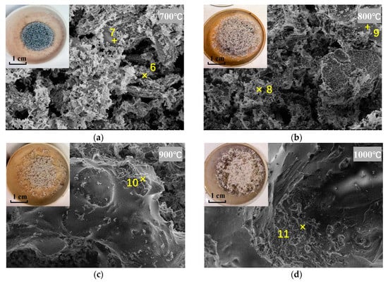 The ash after leaching showed similar macro and microstructures as that of the original ash at 700 °C (Figure 4a). However, wheat straw ashes after leaching showed an obvious porous structure in the SEM images at 800 °C (Figure 4b). Loose ashes (Point 6 on Figure 4a and Point 8 on Figure 4b) adhered to the molten areas (Point 7 on Figure 4a and Point 9 on Figure 4b). Ash heated to 800 °C showed an incompact appearance, although the microstructure was evident in the porous condition, indicating that the washed wheat straw ash was slightly melted and classified as slightly sintered. Sintering appeared as the heating temperature increased to 900 °C (Figure 4c). Unmolten ashes (Point 10 in Figure 4c) still existed at 900 °C, indicating that WSGL performed better than WSGO at 900 °C, which revealed that wheat straw after leaching had a negative tendency to generate sinters under this condition. An SEM image of WSGL ash heated at 1000 °C is shown in Figure 3d. The ashes were primarily pale in color, with a small amount of ash forming a hard and dense precipitate, which was different than that of WSGO. Un-sintered particles (Point 11 in Figure 4d) with a similar microstructure to that of Point 5 in Figure 4c were observed under SEM. Melted particles existed in WSGL, although, unlike in WSGO, the leaching process had already decreased the risk of sintering at 1000 °C.