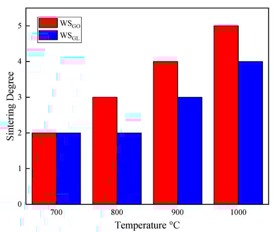 The sintering degrees of leached and unleached biomass used in this study at different temperatures are shown in Figure 5. At 700 °C, WSGO and WSGL were both slightly sintered and classified as Degree 2. However, WSGO showed more severe sintering after 700 °C. WSGO samples heated at 800, 900, and 1000 °C were hard sintered (Degree 3), very hard sintered (Degree 4), and completely melted (Degree 5), respectively. The sintering degree of WSGL was generally lower than that of WSGO, indicating that leaching improved the wheat straw sintering characteristics. The sintering degrees of WSGL increased from slight sintering (Degree 2) to very hard sintering (Degree 4) from 800 °C to 1000 °C. The effectiveness of leaching is generally attested to, e.g., by Said et al. [23].