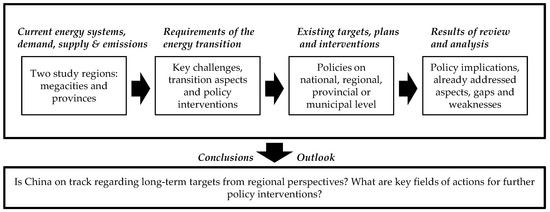 The analysis is based on an overview of major challenges of energy system transition in China on the regional level and the identification of key transition aspects and required actions. In order to analyze the regional policies, we selected regions in China that are specifically affected by these challenges. We consider two metropolitan regions in eastern China, the Beijing–Tianjin–Hebei (BTH) region and the Yangtze River Delta (YRD) region, each of which plays a central role in the Chinese energy system in terms of economic growth and energy consumption, while they have significant differences in the energy system layout. A detailed characterization of the energy systems of the two metropolitan regions is provided in Section 3, including a well-founded picture of the current situation, followed by a discussion of specific challenges, transition aspects, and fields for policy interventions for the energy system transition in Section 4. In Section 5 we provide a systematic review of current available policies related to energy transition targets at different administrative levels. The analysis finally focuses on how these policy plans comply with the main challenges. We specifically identify where regional policies currently fail to pave the way for a target-oriented energy system transition at the beginning of Section 6 and discuss possible implications for regional integration to solve the challenges from a long-term perspective. Figure 1 provides an overview of our approach for this analysis.
