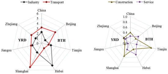 Energy intensity in the residential sector is calculated as energy consumption per capita differentiated by urban and rural areas (see Figure 3). Heating demand in winter causes higher residential intensity in BTH compared to YRD and the national average. Shanghai, Beijing, and Tianjin have the highest urban energy intensity, indicating higher living standards, and relatively high rural intensity, indicating the long commuting distances because of the large urban scale. Hebei Province has relatively high urban and rural energy intensity, although the urbanization rate is the lowest of all considered provinces. Comparing Figure A1 and Figure A2 with Figure A3 reveals an obvious interrelation between higher shares of electricity use plus district heating and lower energy intensity. Rural areas with still considerable shares of traditional use of coal and biomass have mostly higher intensity. The differences in energy consumption structures of urban and rural areas and the ongoing urbanization process, especially in Hebei, Jiangsu, and Zhejiang, cause high uncertainty about future development; however, there is the potential for significant efficiency improvement. (Note: not all traditional energy use, like biomass, is included in the statistics.)