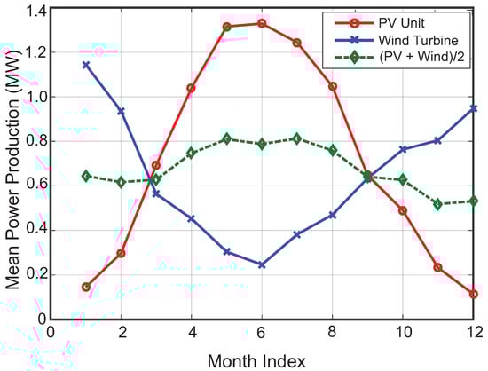 Figure 2 shows the average monthly powers produced by solar and wind RES. The variations in generated power are plotted for a 2.0 MW PV unit and a 2.0 MW wind turbine at Location C, which is shown in Figure 3. Average monthly values are used based on the assumption that the correlation between the monthly cumulative powers produced by these RES is a better indicator of seasonal influences. On the other hand, hourly correlation might be greatly affected by the day-night variations of sunlight, and the daily wind profile may not follow the same pattern on a similar day such as in [32]. Significant variations in the individual power profiles of solar and wind RES in different months can be observed. However, when the two outputs are combined, overall variations are significantly eliminated.