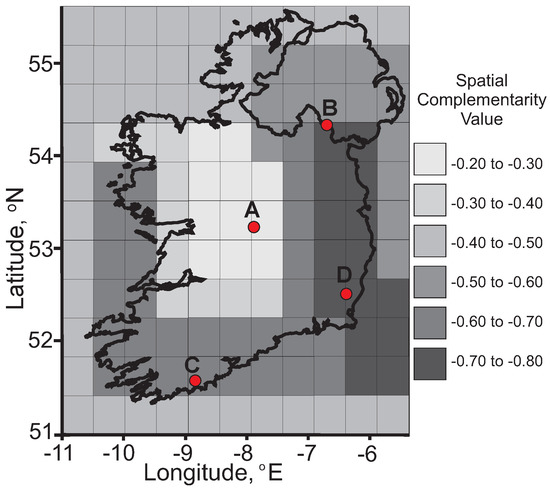 Spatial Complementarity: Map of Ireland showing average complementarity values in different regions. Each of the four labeled sites has a different complementarity value.