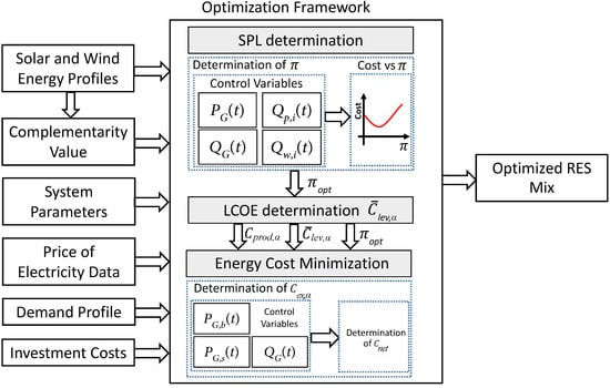 Figure 4 shows the block diagram of the proposed framework. A flexible, unified framework is developed that can be used to determine appropriate RES mix according to all the relevant factors at MG site. To enable maximum flexibility and considering the fact that the objective is to plan RES mix, while simultaneously considering the impact of RES mix on MG operations, an iterative approach can be adopted. The value of is varied and LCOE of RES mix is computed. Then, for each value of and its corresponding LCOE, the energy production cost of the RES mix is determined. In the determination of energy exchange cost, the overall SPL is included as a separate constraint. A minimum value of SPL exists due to RES mix and system constraints, such as thermal capacity of feeders, etc. [39]. The value of is determined through feasibility analysis of the cost minimization problem. This stage is shown as SPL determination in Figure 4. The next step is to determine the feasible optimized value of SPL at which the energy exchange cost is minimized. Then, the values of , , and are fed to the cost minimization block, where the resulting energy exchange cost is determined. This cost is added to the energy production cost to compute a net cost. The final step in this framework is to determine the optimized RES mix, which is the one that minimizes the net cost.