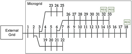 To test the proposed framework, an IEEE 33-bus balanced radial distribution system was used that had been modified to a MG [1,2]. Detailed parameters of this system can be found in [48]. For the simulation purpose, the MG was assumed to have a fixed load demand of 3.7 MW and 2.3 MVAr. Figure 5 shows the modified structure of this bus system. The maximum capacity of this system, , was 100 MVA. The voltage magnitude is limited to [0.9 1.1] per unit. All wind turbines were assumed to have similar characteristics (the same is true for PV units) and the generation capacity of each source was 2.0 MW. Furthermore, only wind turbines were considered for reactive power support. For PV units, it is worth mentioning that an inverter based reactive power compensation at full power output requires the inverters to be sized such that they have larger capacity for the same real power rating of power generation unit. As the inverter cost is associated with its current rating, additional inverter capacity implies higher costs of energy production [49]. For this reason, PV units were assumed to operate at unity power factor [50].