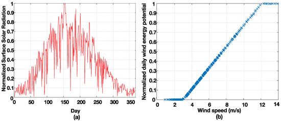 (a) Normalized surface solar radiation at Location C; and (b) normalized daily wind energy potential at Location C.
