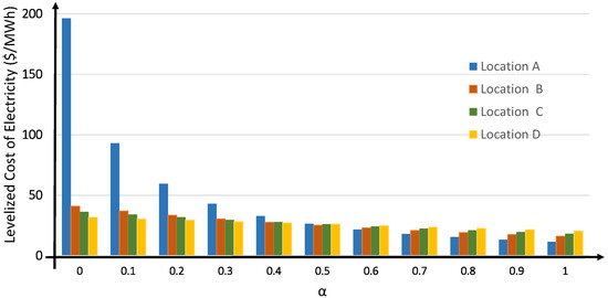 The impact of RES mix on the levelized costs of electricity, of RES for each value of is shown by Figure 8. The annualized investment costs of 2 MW solar PV unit and 2 MW wind unit were assumed to be $120/kW and $190/kW, respectively [55]. To calculate these results, an annual discount factor of 5% and a planning horizon of 20 years were used [2]. From the results, it can be inferred that the LCOE is higher for the location where the RES potential is low. For instance, when moving from Location A to Location D, the normalized energy potential of solar decreased (see Table 2). As a result, with fixed investment cost, LCOE of solar (i.e., = 1) increased. Similarly, for = 0, the potential of wind was the lowest at Location A, which resulted in a higher measure of LCOE. For = 0.5, LCOE was relatively constant.
