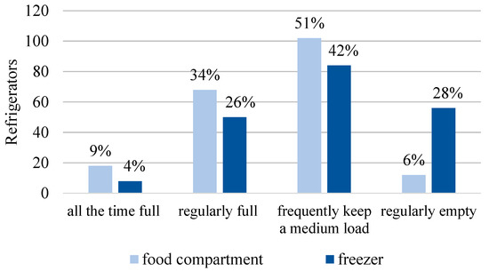 The higher percentages correspond to the consumers frequently keeping their refrigerator at a medium load—51% of consumers (102 refrigerators) for the food compartment and 42% (84 refrigerators) for the freezer. On the other hand, a low percentage of consumers keep their refrigerator full all the time—9% for the food compartment and 4% for the freezer. According to the statistic shown in Figure 1, an average of eight thermal loads were defined in this work (see Table 2). Moreover, during the surveys, the temperature of the room where the refrigerator was located was also measured; this way, an average temperature sample was set during some experimental tests to analyze their effect on the refrigerator’s performance.