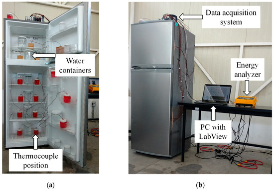The refrigerator was used in this research to evaluate the thermal behavior of the compartments, as well as the energy consumption when the thermal load varied in both compartments according to the surveys. To measure the temperature, 15 J-type thermocouples were used with an uncertainty of measurement of ±0.3 K. Eleven thermocouples were distributed in the food compartment and were located within containers of 0.245 L with a mixture of 50% water and 50% glycol. Four thermocouples were placed in the freezer inside wooden cubes, due to their high capacity of humidity absorption, thus allowing a constant measurement of the temperature. In Figure 2a, the distribution of the thermocouples in both compartments is illustrated; moreover, the distribution of the water compartments can be seen, simulating the thermal load for a specific case. On the other hand, to measure the energy consumption, a Fluke 1735 energy logger (Fluke, Everett, WA, USA) calibrated with a measurement error of ±1.5% was utilized.