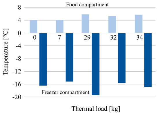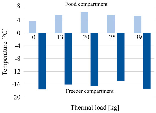 On the other hand, in Figure 4, the thermal behavior of both compartments at different thermal loads and at a room temperature of 25 ± 1 °C is illustrated. It is worth mentioning that these thermal loads are the most representative for the room temperature measured in the surveys. It can be observed in the figure that both compartments represented a variable thermal condition, without having a clear correspondence between the thermal load and the compartment temperature. The maximum temperature variation in the food compartment was 2.2 °C (0 and 20 kg), while, in the freezer, it was 2.7 °C (0 and 25 kg).