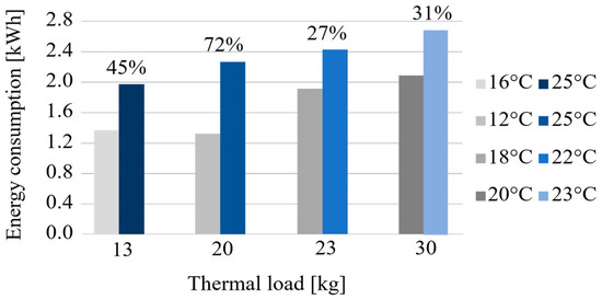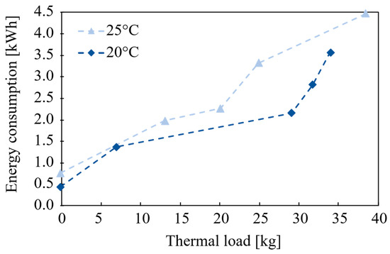 - It was observed that the energy consumption had a great effect due to the thermal load increase where, for example, for an ambient condition of 20 °C, an increase from 0.4 kWh (0 kg as reference) to 3.5 kWh (34 kg) was observed; this increase was from 0.8 kWh (0 kg) to 4.5 kWh (39 kg) for a temperature of 25 °C.