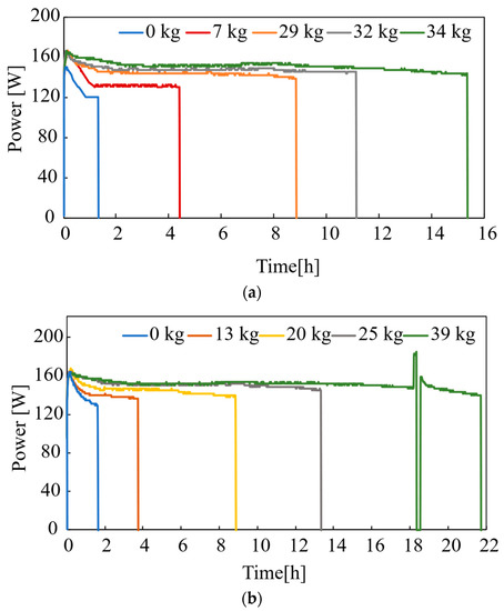 As mentioned before, the ambient temperature affects the refrigerator’s energy behavior to a large extent, as can be seen in Figure 6a,b. For the specific case of the reference load (0 kg), there was a difference in the average of the power of approximately 11 W, which indicates a power increase when the room or ambient temperature increased by 5 °C. This reflects an increase of 0.05 kWh in energy consumption. Thus, it is well known that the domestic refrigerator’s electricity consumption is very sensitive to the ambient temperature [11]. Another aspect to observe in Figure 6b is that the thermal load of 39 kg represented the condition that consumed the most energy and whose on-time of the compressor was approximately 21 h. Moreover, in this case, it can be noticed that, at around 18 hours, a defrost occurred, indicated by the power increase, which in turn caused the compressor to shut down. Finally, it can be concluded that the on-time of the compressor on the first start increased when the thermal load increased; this behavior was reflected in the total energy consumption of the refrigerator.