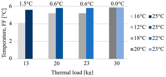 In order to expand this study based on survey data, in Figure 7, the average temperature of the food compartment for a constant thermal load and under two different conditions of room temperature is illustrated. The fading of the gray color in the bars represents a condition of low room temperature, whereas the discoloration of the blue color represents a higher room temperature. In Figure 7, it can be observed that, for a certain load, an increase in the room temperature caused a rise in the temperature of the fresh-food compartment (FF). For example, for the load of 13 kg, the increase from 16 to 25 °C in room temperature caused an increase of approximately 1.5 °C in the food compartment. Note that the foregoing is based on the thermal stability in the food compartment and for a fixed condition of the damper set at 5. For the thermal loads of 20 and 23 kg, a very similar thermal behavior existed, where the average temperature of the compartment experienced an increase for both room temperatures, showing an average thermal difference of 0.6 °C in both cases. Finally, for the thermal load of 30 kg, it can be noted that the average temperature reached in the food compartment for both room conditions was almost the same, around 6 °C.
