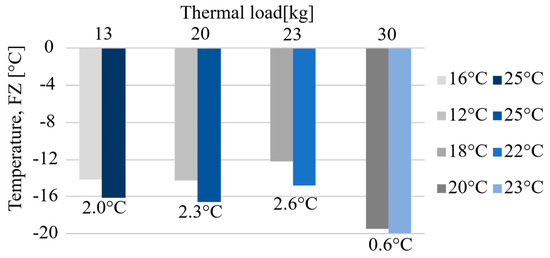 With respect to the average thermal behavior of the freezer (FZ), Figure 8 shows the ambient temperature effect for constant thermal loads. It can be seen that, when a constant thermal load was subjected to two room temperatures, the lowest average freezer temperature corresponded to the highest room temperature condition. For example, for the loads of 13, 20, and 23 kg, a difference in the temperature of 2, 2.3, and 2.6 °C, respectively, was obtained in this compartment, observing the effect of the room temperature rise. For the load of 30 kg, as also seen in Figure 7, the thermal difference was practically very small (about 0.6 °C).