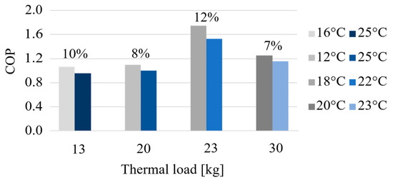 Figure 10 illustrates the behavior of the coefficient of performance (COP) of the domestic refrigerator under study. It can be seen that, for a constant load, there was a decrease in COP as the room temperature increased. For example, for a thermal load of 13 kg, there was a decrease in COP of 10% when going from 16 °C to 25 °C. An increase in room temperature reduced the overall refrigeration system COP by increasing the difference between the evaporating and condensing temperature.