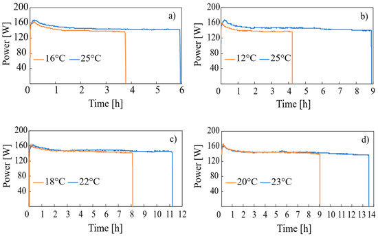 In Figure 11, the power of the first start of the compressor is illustrated, for the load variation shown in Table 4. Figure 11a shows the difference in both the starting time and the power for a thermal load of 13 kg, which presented an increase from 16 °C to 25 °C in the ambient temperature. This behavior was also observed in the other thermal loads subjected to different conditions of room temperature. For example, for the thermal loads of 20 kg and 30 kg (Figure 11b,d), a greatest increase in the compressor operation time, 5 h approximately, was presented. The thermal load of 30 kg appears to be the condition that prolonged this time the most for the two conditions of room temperature, representing an increase of 0.62 kWh. Hence, the influence of the ambient temperature on the consumed power by the compressor on the first start was confirmed with these behaviors.