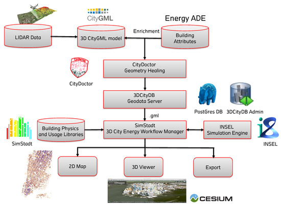- Nouvel, R.; Brassel, K.H.; Bruse, M.; Duminil, E.; Coors, V.; Eicker, U.; Robinson, D. SimStadt, a workflow-driven urban energy simulation platform for CityGML city models. In Proceedings of the CISBAT 2015 International Conference on Future Buildings and Districts, Lausanne, Switzerland, 9–11 September 2015; EPFL Solar Energy and Building Physics Laboratory: Lausanne, Switzerland, 2015. [Google Scholar]