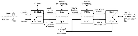 So far, the new functionalities are not yet added to the SimStadt platform itself and therefore, different tools need to be used to calculate each step. The calculation sequence needed in this study is shown in Figure 4.